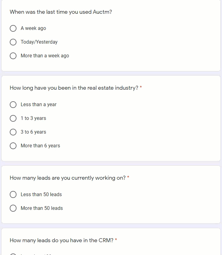 The reason behind taking this criteria into account was because the product was catered toward high functioning agents who produced more deals hence people who work with more than 50 leads at a given time are assumed to be producing more deals. Also, they needed to have used Auctm so that I can probe in with Critical Incident technique where I will ask for participants to recall incidents therefore they needed to have used the app.